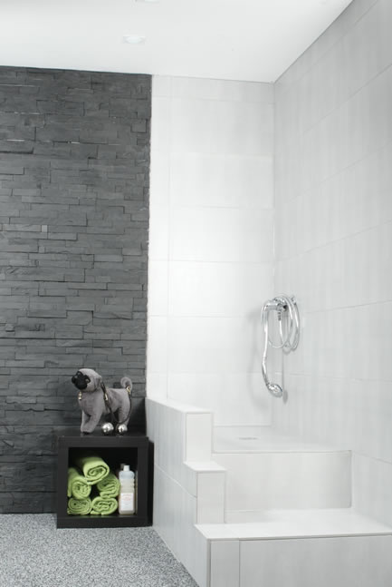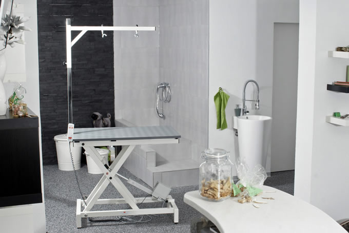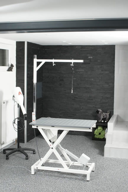 Die Hundebadewanne ist für alle Hunde ob jung oder alt leicht zugänglich. Der Boden wurde durch einen rutschfesten Steinboden (der im ganzen Hundesalon verlegt wurde) ersetzt um das ausrutschen mit nassen Pfoten zu vermeiden.
